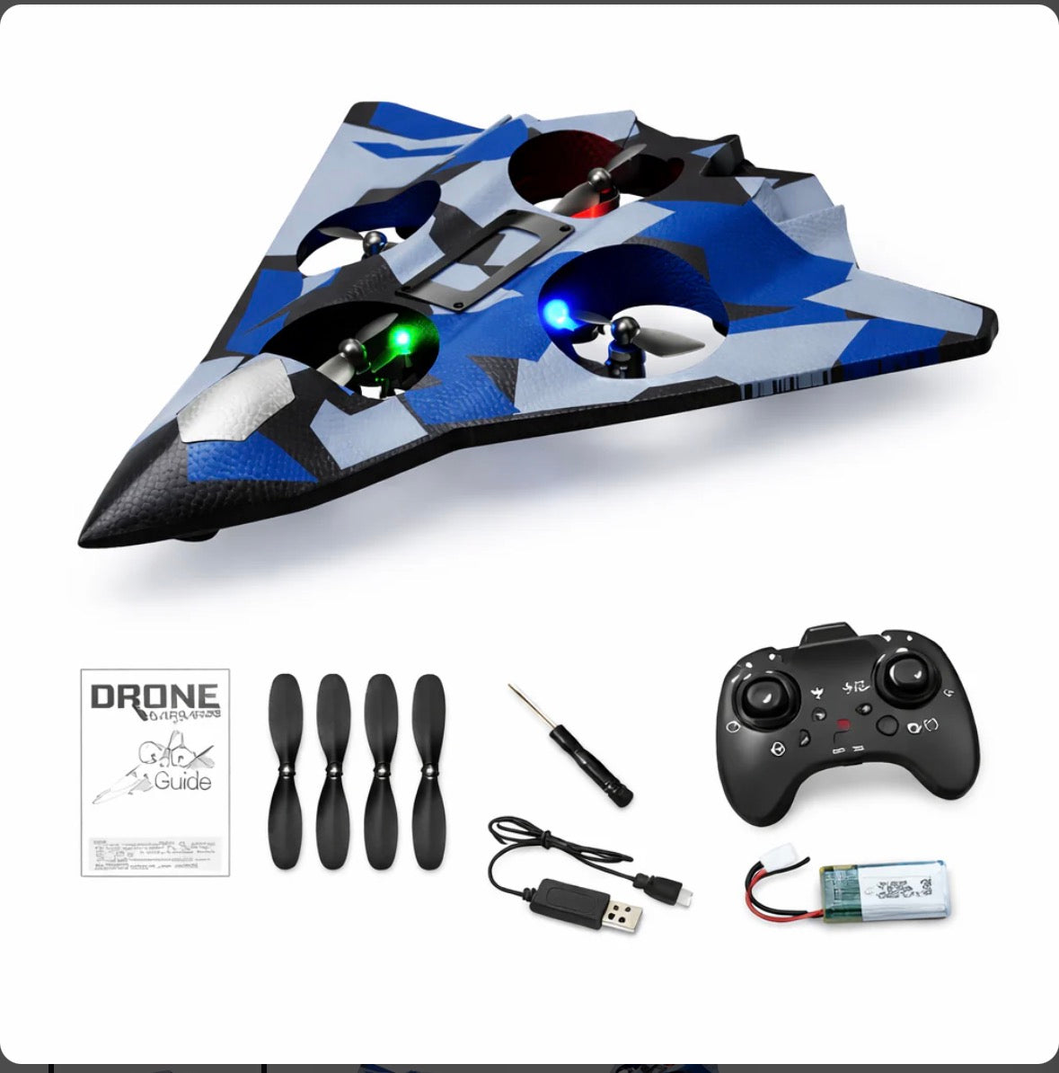 The B2 Fighter Plane is a remote control flying plane designed in a stealth aircraft style. It is suitable for beginners and kids who enjoy fighter jet designs. The quad propeller setup ensures stable and smooth flight.