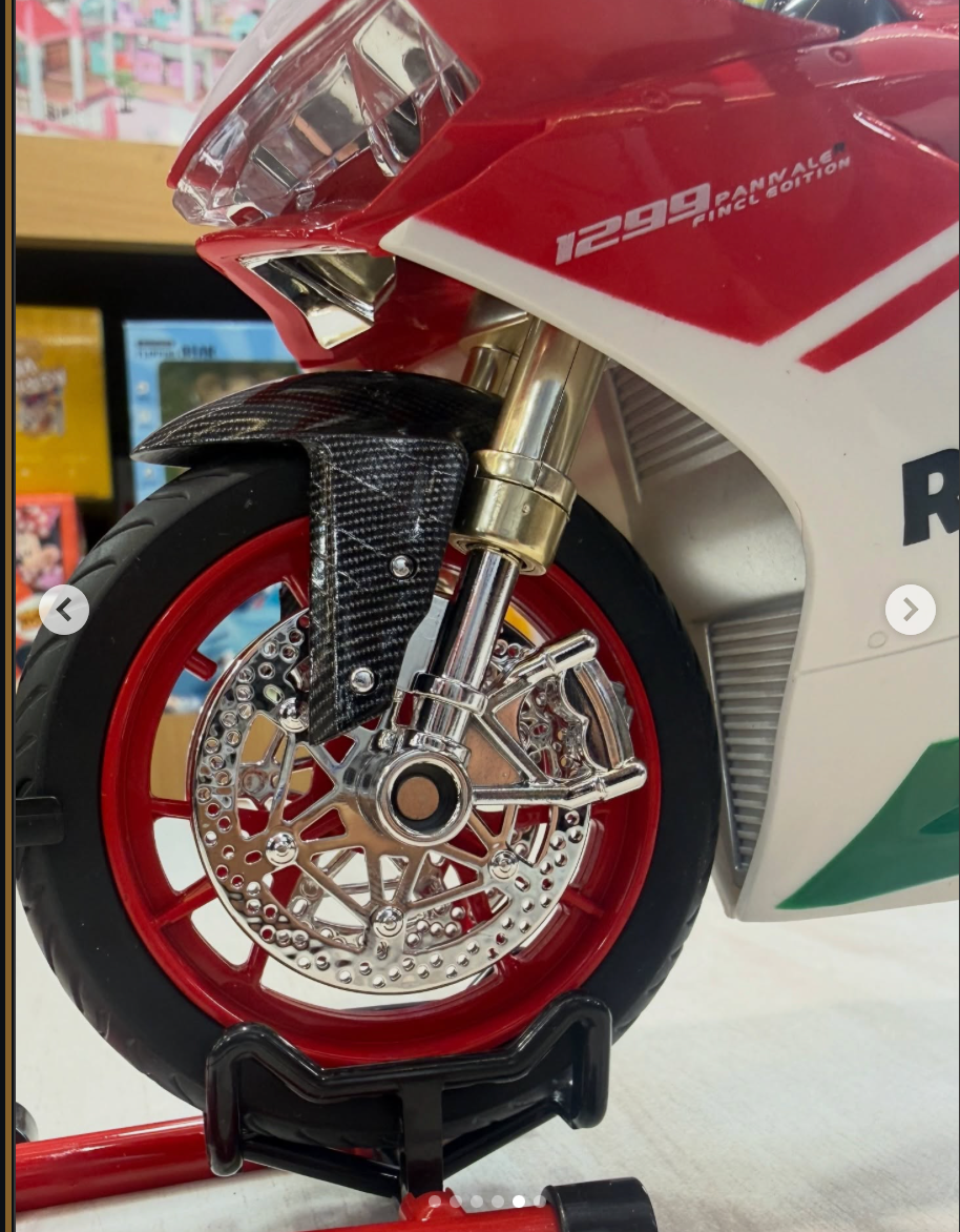 This 1:9 scale Ducati toy bike features a working accelerator, real bike key, lights, smoke effects, and charger. Perfect for kids who love authentic motorcycle details and interactive play.