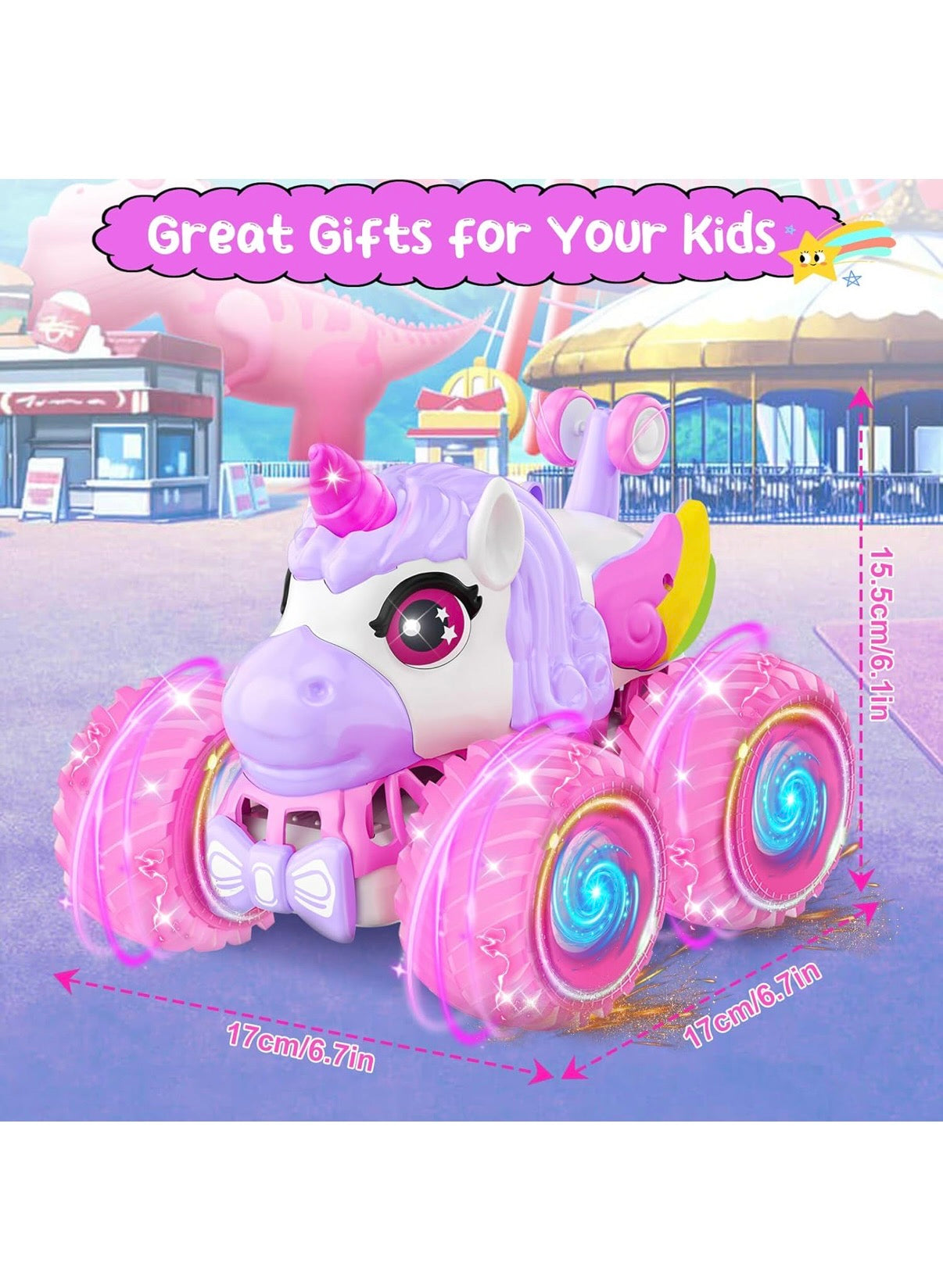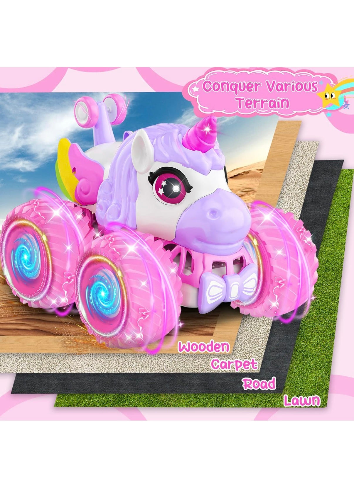 - Unicorn Monster Truck with Colored Lights and Cheerful Music: Unique pink monster truck, large wheels, rainbow lights, dynamic music, the light and music of our car toys can be chose to turn on or turn off Separately to meet different scenes using, that makes our remote control monster truck both friendly to kids and parents, provide a exciting and visually stimulating play time. Perfect toys and gifts for girls 3-10 year old