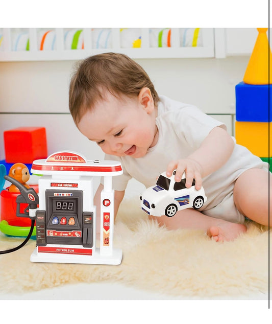 Battery-Operated Mini DIY Gas Station Simulation Model Interactive Refueling Pump & Car Toy Along with Mist Spray Feature Music &Lights Learning Toy for Kids Boys Girls 4+